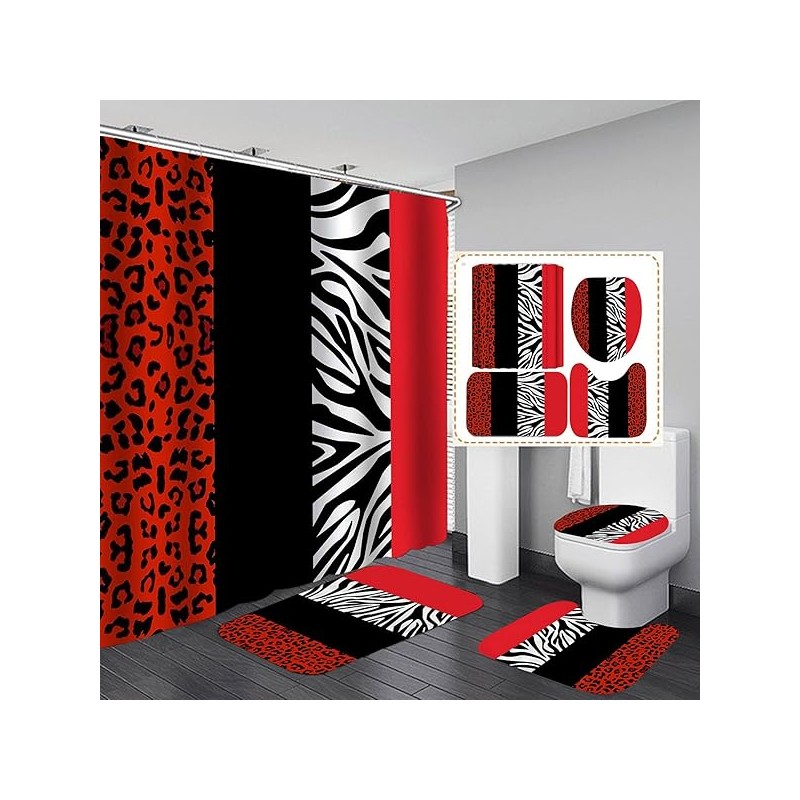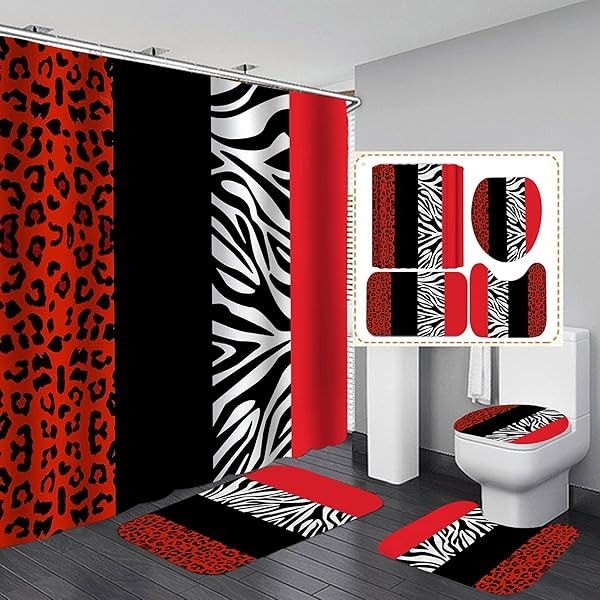 jieprom 4PCS Leopard Print Shower Curtain Set with Rug, Toilet Lid Cover and Bath Mat,Red Black Splice Shower Curtain with 12 Hooks, Complete Bathroom Accessories Decor Set