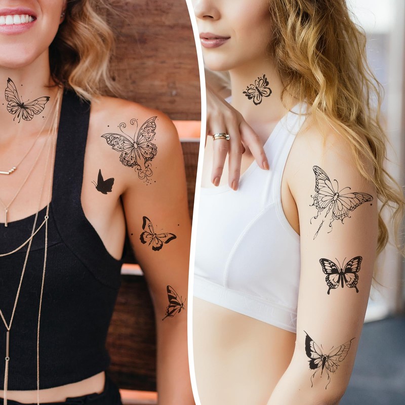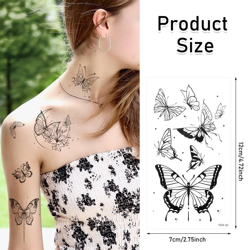 - 【Butterfly Tattoo Sticker Kit】This kit includes 20 sheets containing approximately 170 vivid black line butterfly temporary tattoos in total, each sheet measuring 12x7cm (4.72x2.75 inches). With a variety of designs and sufficient quantities, you can use these realistic butterfly tattoo stickers on your arms, shoulders, back, chest, legs, neck, or any part of your body to stand out in any crowd.