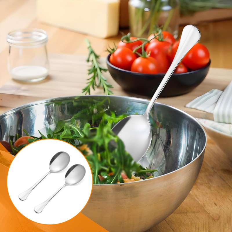 - Ergonomic design: the long handle of our stainless steel cooking spoons ensures safe and comfortable handling, especially for hot soups or cooking at high temperatures. The large spatula surface of the large serving spoon makes serving food easier and prevents spills. Ideal as a salad spoon, sauce spoon or rice spoon.
