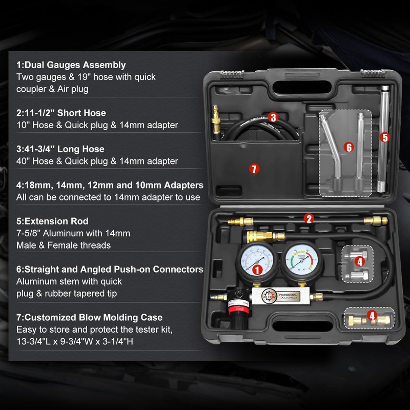 - Cylinder Leak Test: JIFETOR cylinder leak tester is designed to detect a variety of common engine faults: worn piston rings, worn valves, cracks in cylinder walls and blown head gaskets. Connect the tester to one of the cylinders, 45-100psi compressed air is fed into that particular cylinder through the built in pressure regulator. By observing the amount of leakage indicated on the cylinder leakage gauge and by listening to locate the leakage points of the cars system
