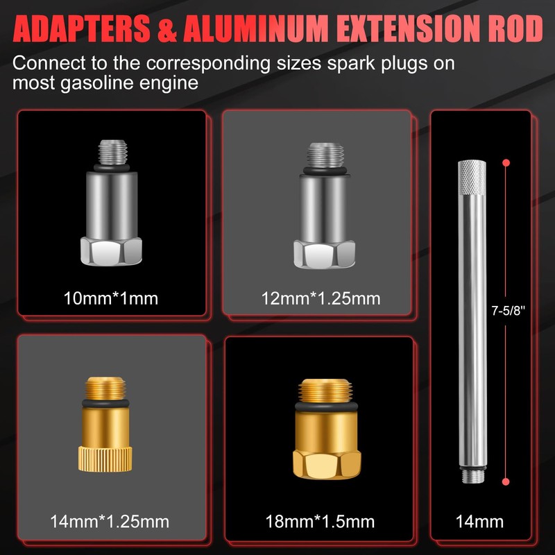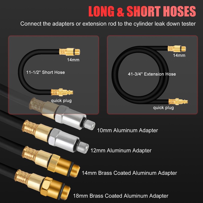 - Special Adapters: Compression leak down tester kit is equipped with special adapter heads of 10, 12, 14 and 18 mm, suitable for any gasoline engine with 10, 12, 14 or 18 mm spark plugs. There are 41-3/4" long & 11-1/2" short rubber hoses with 14mm adapter on one end (After testing, please unscrew the adapters after the cylinder is cooled to prevent the hose from softening and not driving the adapters to rotate together). There is also a 7-5/8" aluminum extension rod with 14mm thread on two ends