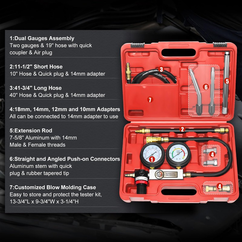 - Cylinder Leak Test: JIFETOR cylinder leak tester is designed to detect a variety of common engine faults: worn piston rings, worn valves, cracks in cylinder walls and blown head gaskets. Connect the tester to one of the cylinders, 45-100psi compressed air is fed into that particular cylinder through the built in pressure regulator. By observing the amount of leakage indicated on the cylinder leakage gauge and by listening to locate the leakage points of the cars system