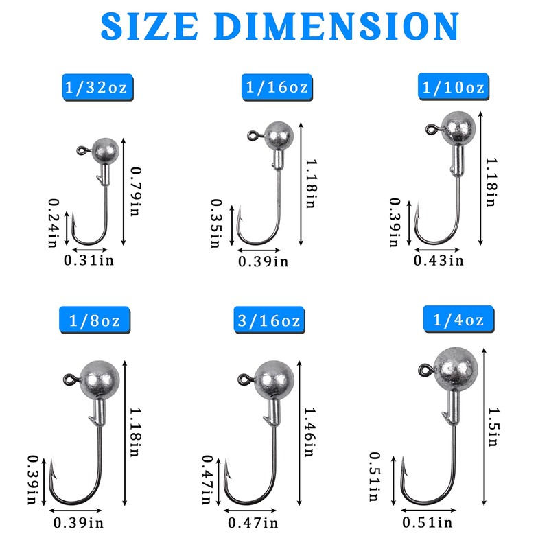 - 10 size fishing jig heads available, 1/32 oz, 1/16 oz, 1/10 oz, 1/8 oz, 3/16 oz, 1/4 oz,3/8 oz, 1/2 oz, 3/4 oz, 1 oz. Different size hooks fit for different situation