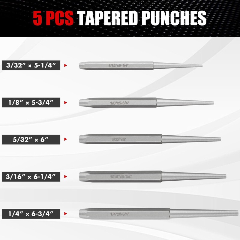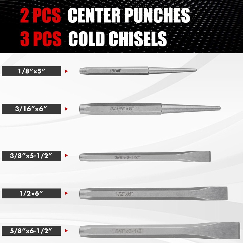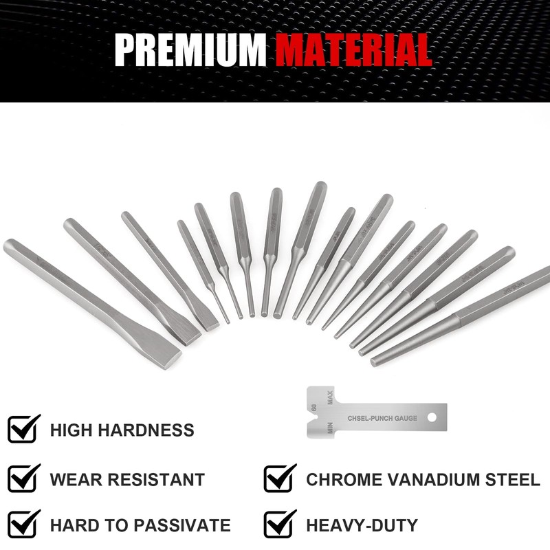 - Premium Quality: Heat-treated chrome vanadium steel has a high degree of hardness which prevents rapid expansion and dulling of chisels and punches