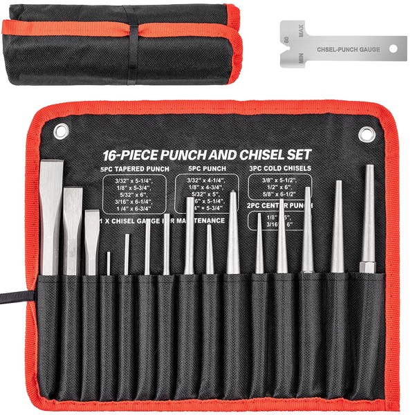 Jiimee 16 Pcs Punch and Chisel Set, Including Taper Punch, Center Punch, Pin Punch, Cold Chisels and Chisel Gauge for Mechanic and Carpenter