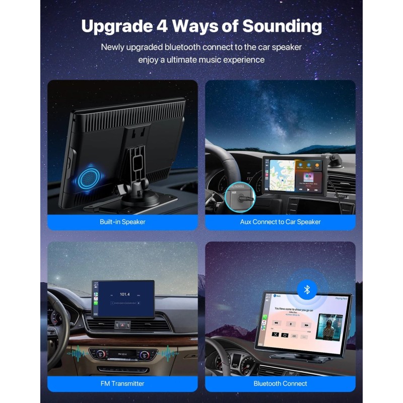 🚗【BLUETOOTH&/FM Transmission/ AUX】Our carplay screen for car supports multiple audio outputs. You can transmit audio to your car speakers by either FM frequency syncing (keep the same channel with the original car’s FM radio) or link to your car's speakers using an AUX cable, enjoy the high-quality stereo sound through the original car audio system. You can also use Bluetooth connection to have the sound play by built-in speaker of the carplay stereo, answer speakerphone calls.