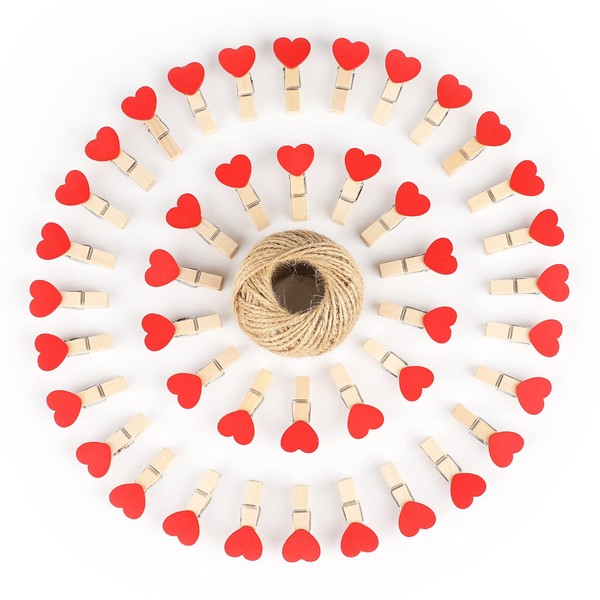 jijAcraft Mini Wooden Photo Clips,3.5 CM Heart Pegs,100 Pcs Mini Wooden Clothespins,Red Photo Paper Clips with 30 Meters Jute Twine for Valentines' Day DIY Decorations