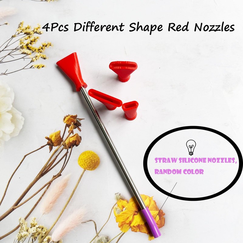 - Package included 4Pcs different shape red nozzles;1Pcs stainless straight straw;1Pcs straw silicone nozzles, random color.