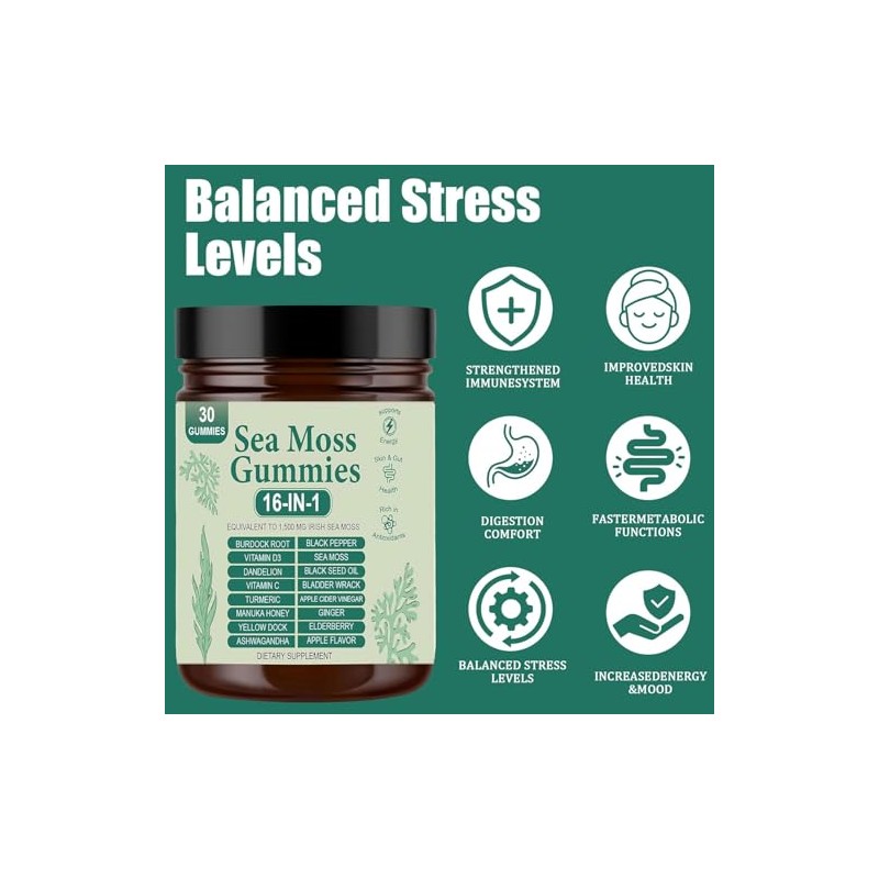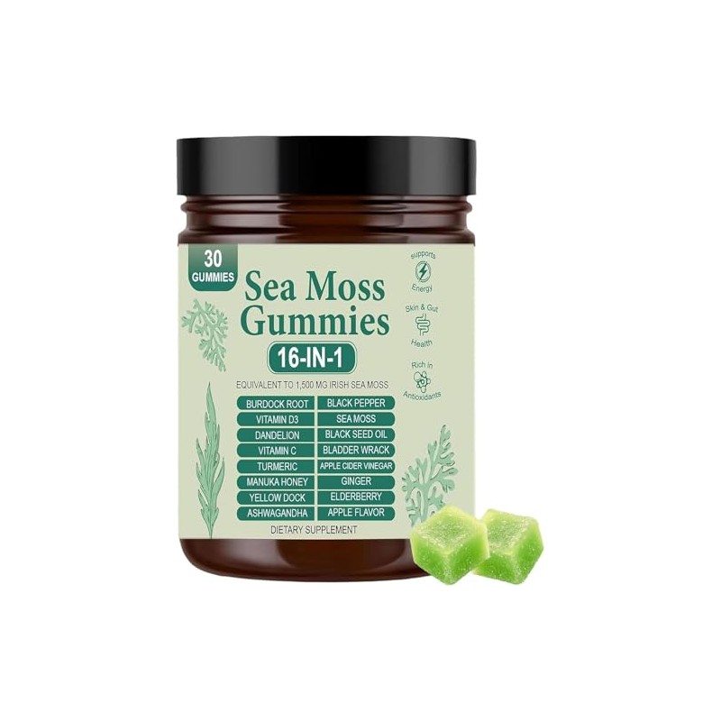 - INTRODUCING THE 16-IN-1 - A powerful combination of sea moss gummies, black seed oil, ashwagandha root, bladder wrack, elderberry, and burdock root, infused with potent ingredients, including turmeric, apple cider vinegar, manuka honey, dandelion, vitamin C, vitamin D3, yellow dock, black pepper, ginger and apple. Each gummy vitamin offers immune support in a delicious, green apple flavor. Plus, the magnesium in sea moss vitamins helps support muscle recovery and promotes healthy digestion.