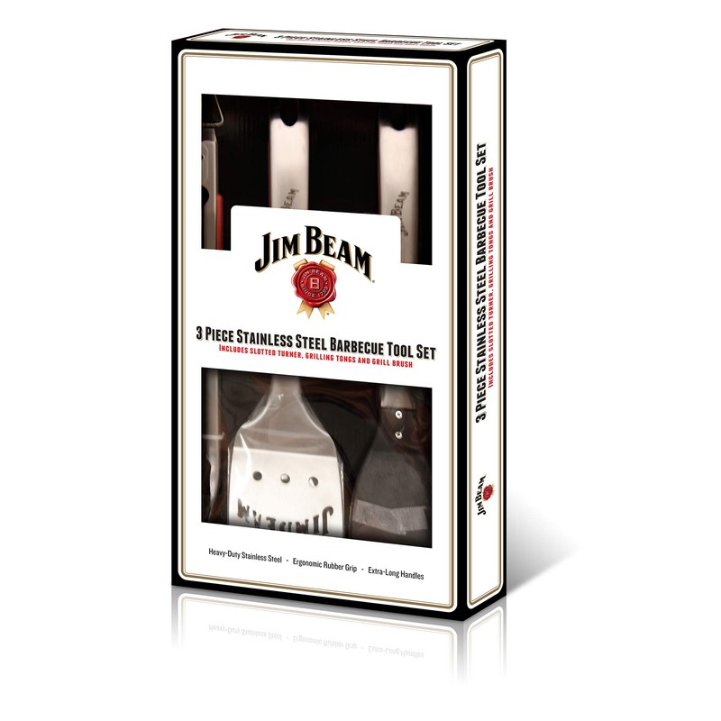 Grill like a pro with the Jim Beam 3 Piece Stainless Steel Barbecue Tool Set. This attractive three piece set features a durable stainless steel construction, extra long handles and built-in hanging loops for easy grill- side access. Each tool features rubber gripped handles for both performance and comfort. The grill brush features a dual purpose brush/scraper with beveled bar edge to help you keep your barbecue in top shape year round.