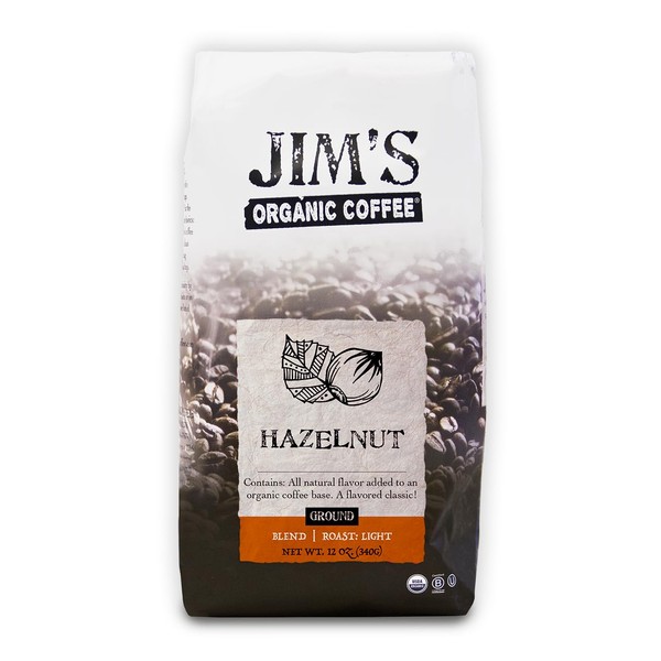 Jim’s Organic Coffee – Hazelnut, All Natural Flavored Blend – Light Roast, Ground Coffee, 12 oz Bag