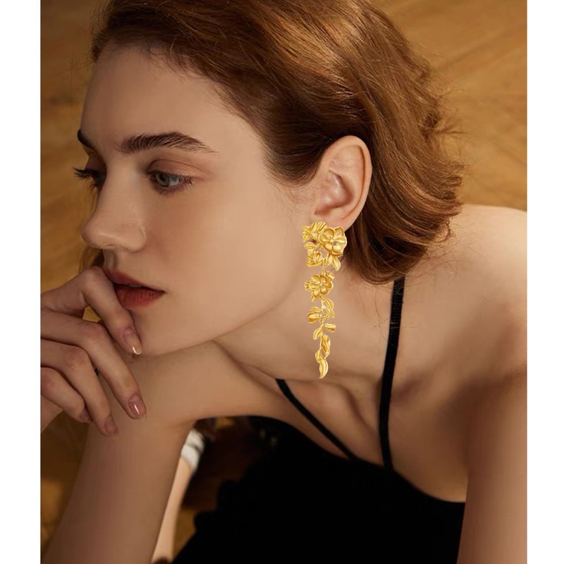 JIMARIN Bohemian Dainty Gold Long Hawaiian Chandelier Flowers Floral Dangle Drop Stud Earrings for Women Wedding Bridal (Gold Long Flower)