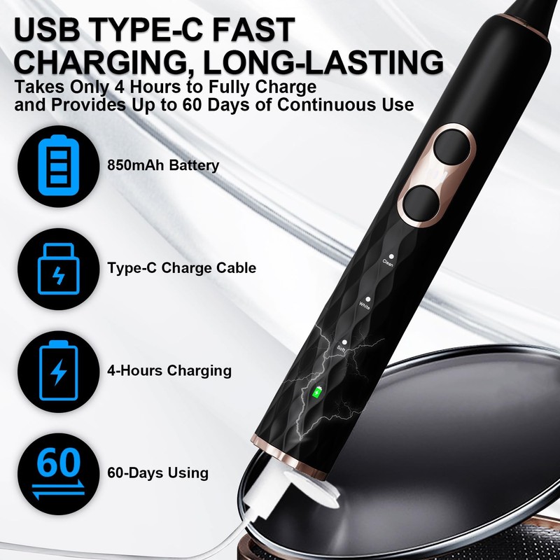 ♥♥ 5. The toothbrush is powered by a high-capacity 850mAh battery, providing up to 60 days of continuous use on a single charge. The USB TYPE-C rechargeable feature allows for convenient charging anywhere, anytime. A full charge takes approximately 4 hours, ensuring minimal downtime between uses.