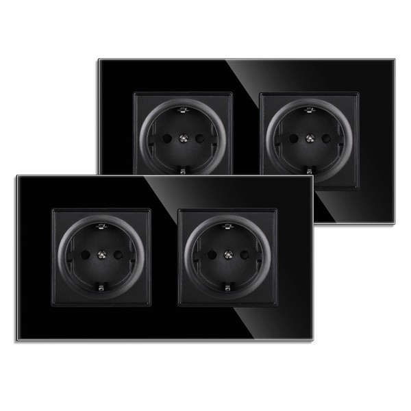 JIMEIDA Double Socket Flush-Mounted 16 Amp with Black, Tempered Glass Pane, Standard Socket, Protective Contact Wall Socket, 157 x 86 mm, 250 V, Pack of 2