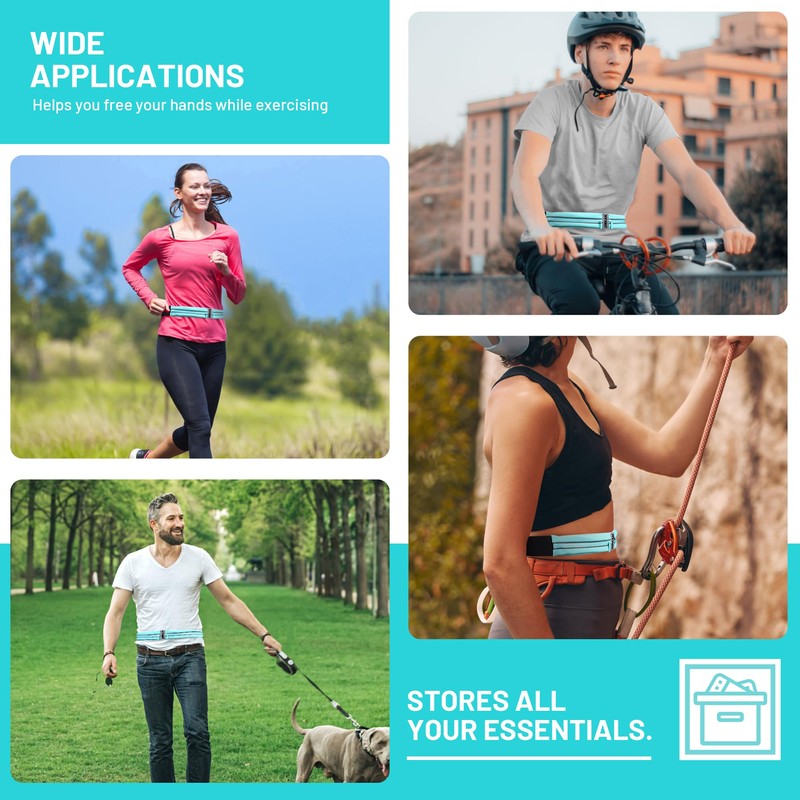 - Professional sports belt for training equipment: the running belt for the phone is made of soft and breathable material and weighs only 90 g. Running belt bags are minimalist and still offer a comfortable feel and sufficient storage space. Feel comfort for your body while you train with a waist bag. A special sweat-proof and waterproof inner layer and the water-repellent zip protect your belongings from sweat, rain and splashes of water.