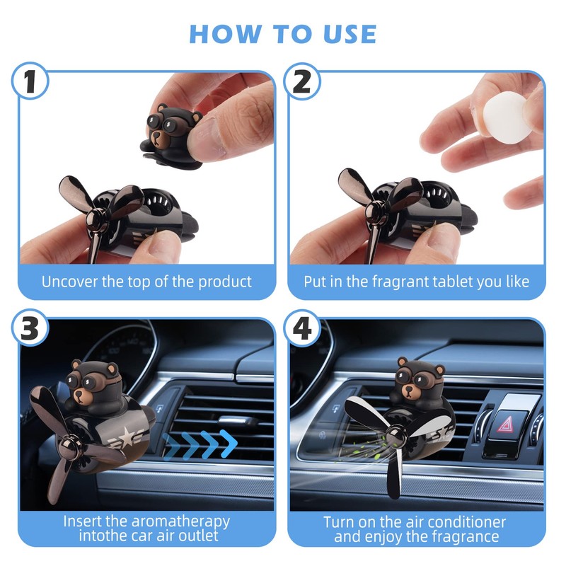 - ★COOL BEAR APPEARANCE-With the shape of cartoon characters pilot and the elements of retro airplanes,it will make a cute and interesting new interpretation of nostalgia and romance.This black bear pilot car air freshener consists of cartoon pilot host and 4 essential oil fragrant tablets(2 tablets more than others, the fragrance lasts longer). It can not only satisfy the fragrance diffusion function, but also can be rotated to increase the fun.