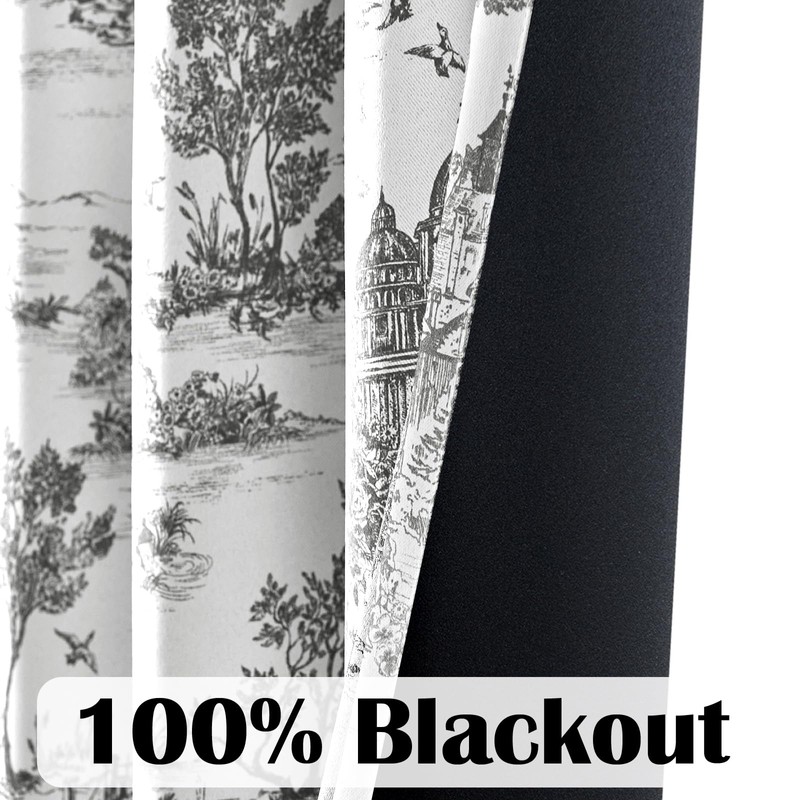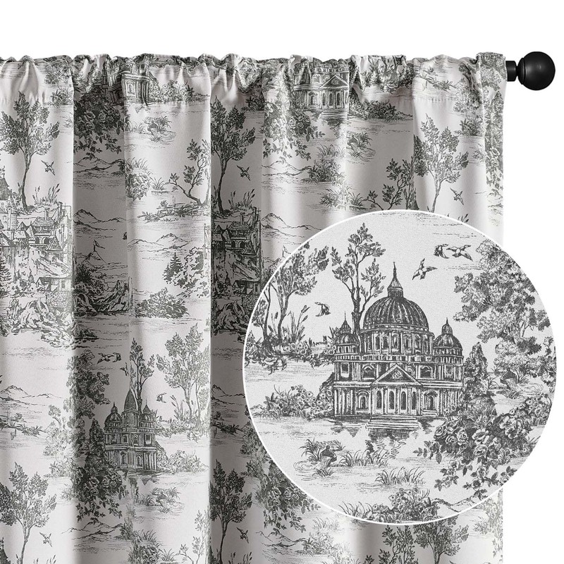 JINCHAN 100% Blackout Toile Curtains for Bedroom, 96 Inch Length Drapes Toile de Jouy French Printed Castle for Living Room, Light Blocking Thermal Insulated Window Treatment Rod Pocket, 2 Panels Grey