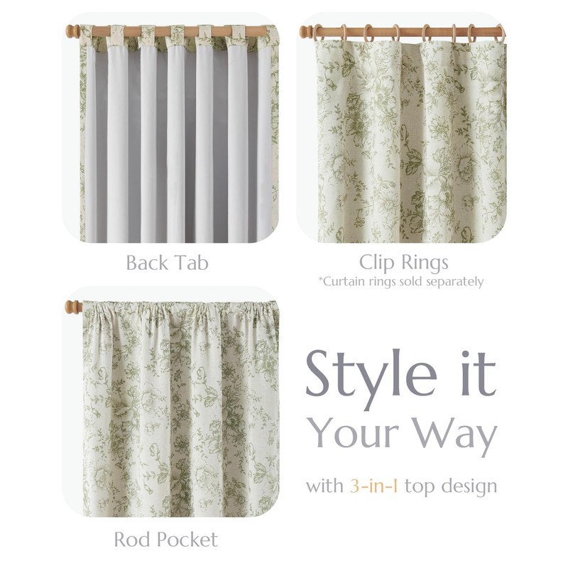 - Multiple Hanging Options: Rod pocket top allows for contemporary touch while back tabs add an elegant flair. This 3-in-1 construction makes these curtains easy to slide through a curtain rod up to 1.5 inch diameter. You can pair them with blinds or other curtains for extra beauty