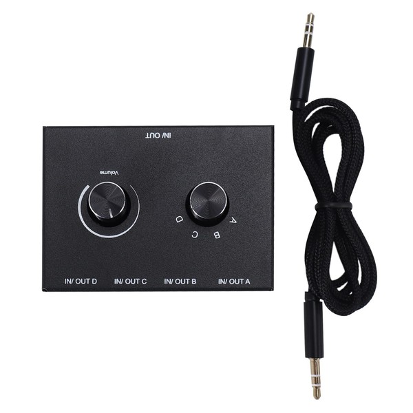 - 4 Port 3.5mm Stereo Audio Switcher: Bidirectional switching Splitter Audio Sharing active speakers and headphones