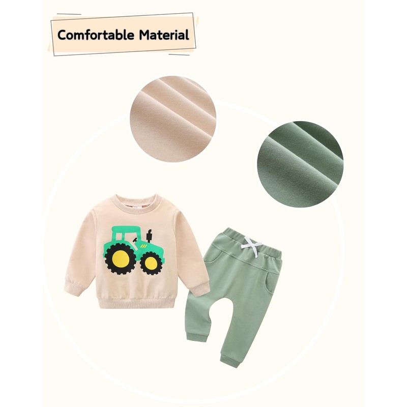 - 【Comfortable Material】This baby boy clothing set is made of 70.3% Cotton, 22.4% Polyester, and 7.3% Spandex. It is soft and skin friendly, while also elastic, designed specifically for your little boy. The match of a pullover sweatshirt and jogger pants is cute and fashionable. In the spring and fall / winter seasons, this toddler sweat suit will be an ideal dressing choice for little ones.