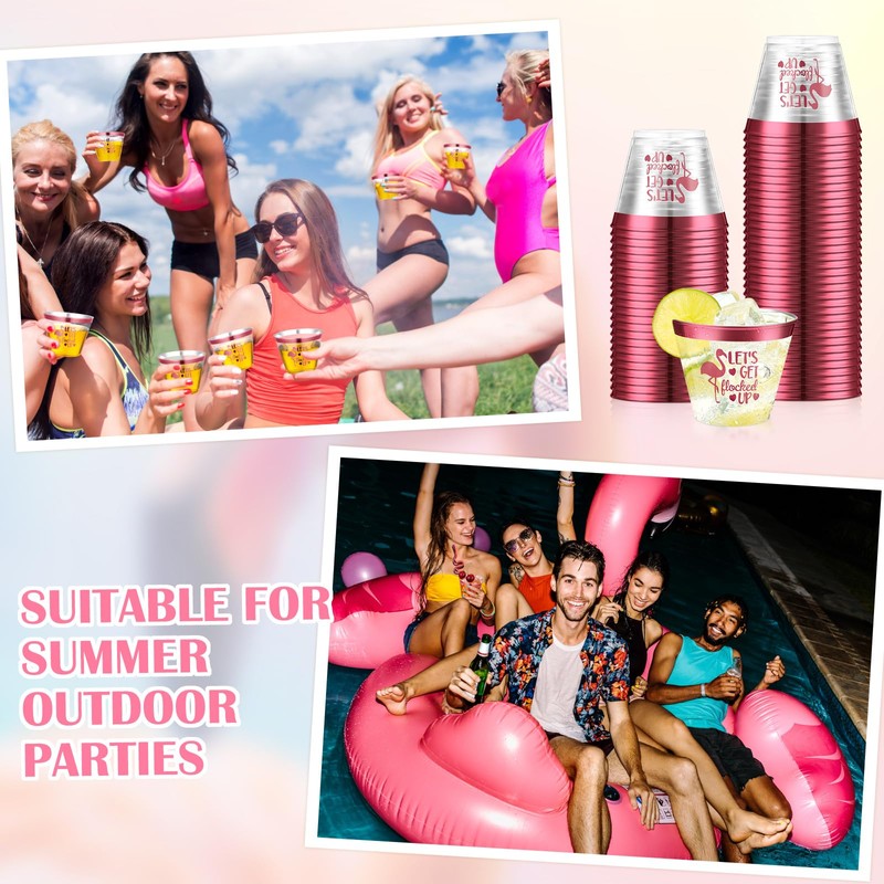 - Classic Design: flamingo themed cups disposable are printed with Flamingo and words Let's Get Flocked Up, which are eye catching and interesting; These disposable cups with bright colors and elegant patterns can create an interesting atmosphere for your beach parties, poolside gatherings, and festive occasions, and easily add a festive atmosphere to any table setting
