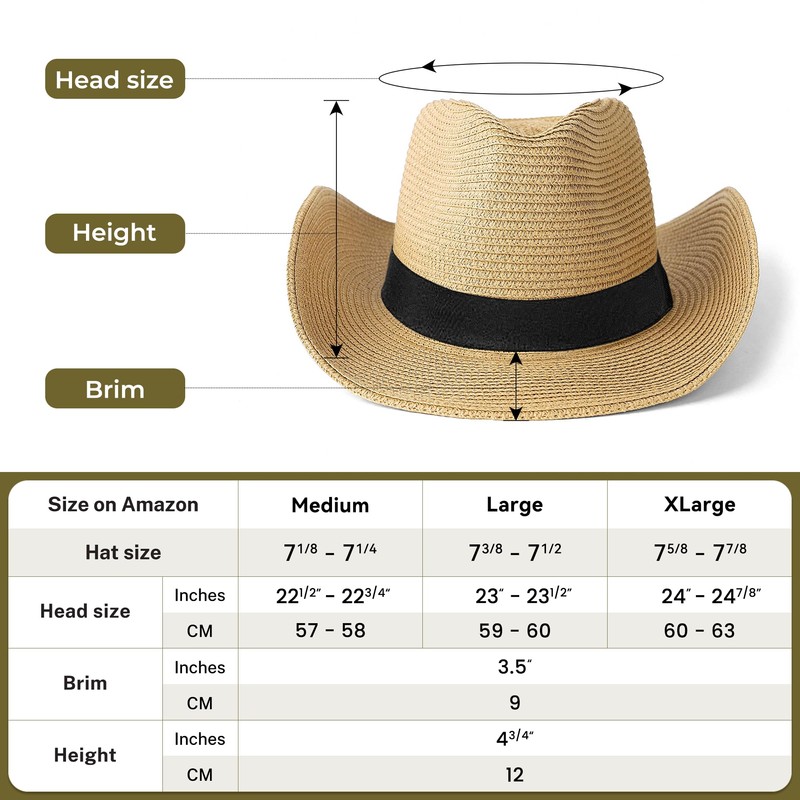 - 【Size】Designed as unisex, this cowboy hat fits most adults。This straw cowboy hats are available in three sizes for you to choose from: M (7 1/8 - 7 1/4 ); L (7 3/8 - 7 1/2 ); XL (7 5/8 - 7 7/8).