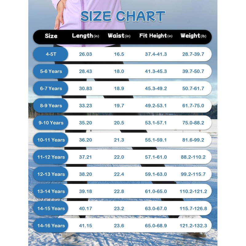 • Size Varirty: These girls' ice skating leggings are available in many sizes. We cut according to the height and weight of American girls of different ages, which is more in line with the body shape of girls, so that they can train more comfortably.