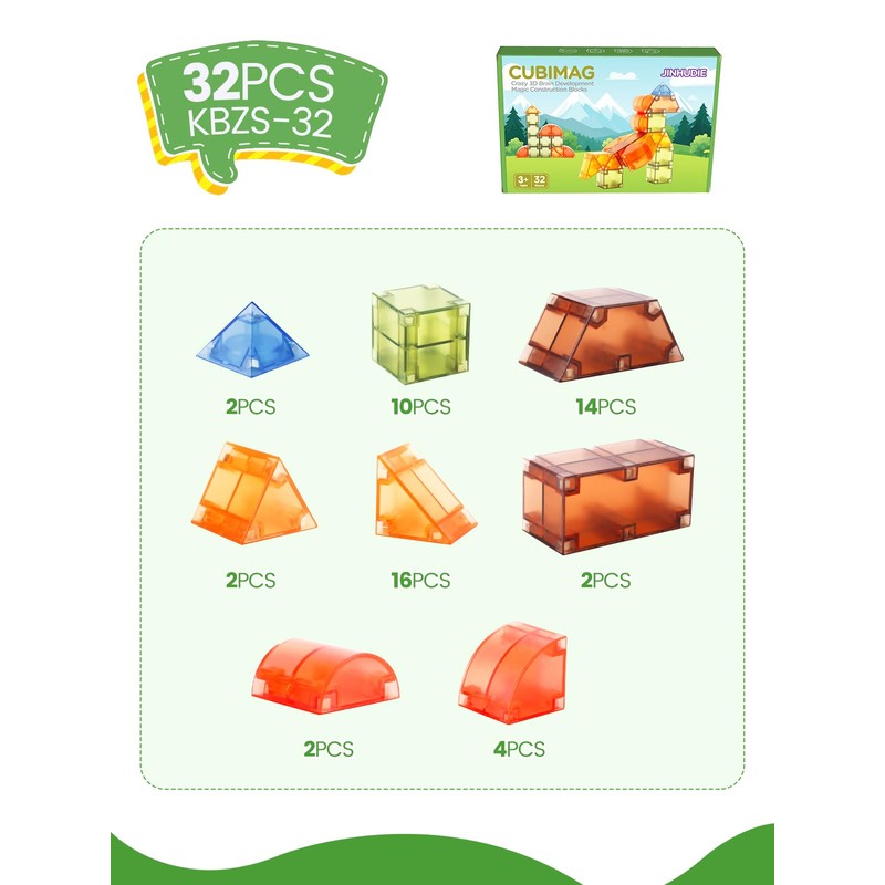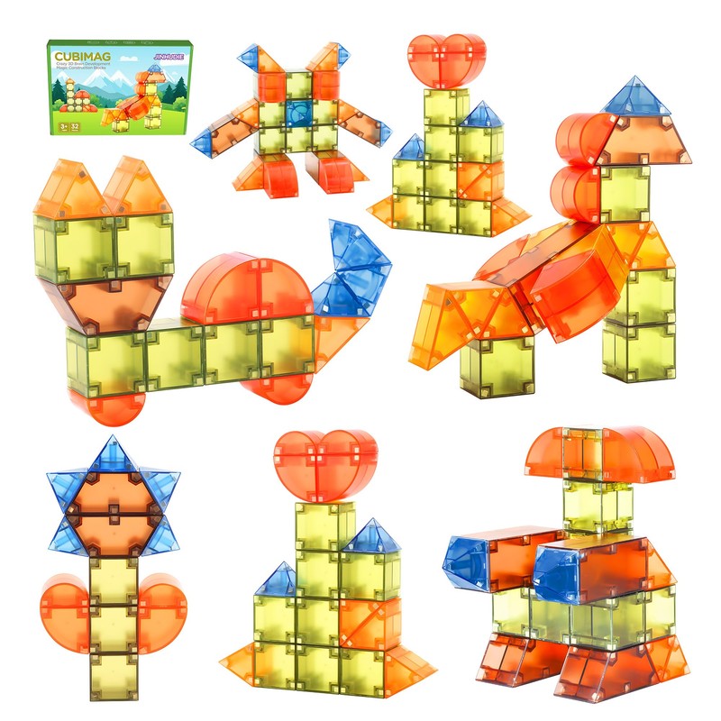 • 【RICH AND COLORFUL】Magnetic Tiles come in beautifully packaged sets that showcase a variety of vibrant colors and shapes, captivating children's attention and enhancing the fun. The 32 blocks allow children to build simple 3D shapes of animals or robots.
