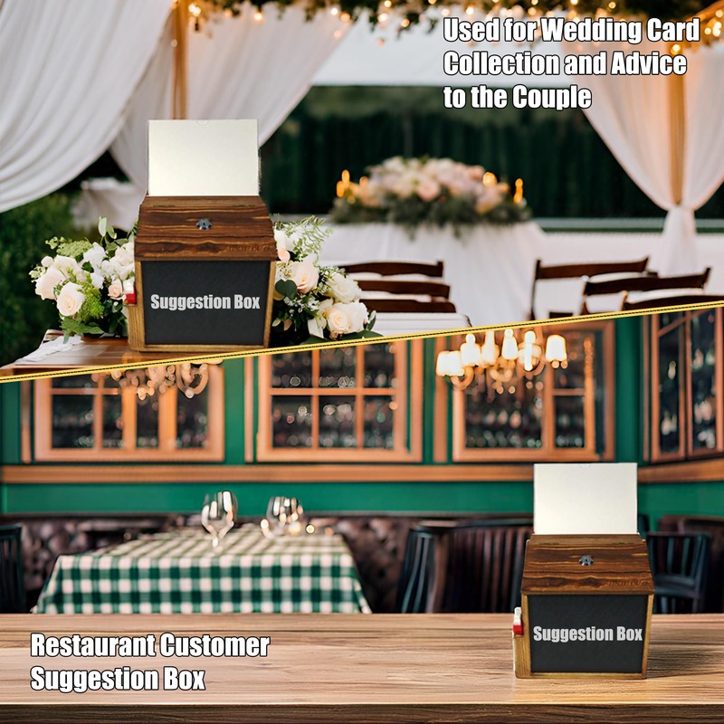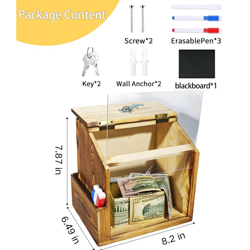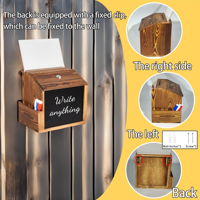 - Package Composition: This wooden suggestion box comes with two wall anchors and two screws for wall mounting. The lock and slot design allows for easy storage while protecting your privacy. There is also a removable blackboard and a Transparent Board, a removable 5*7 acrylic board, five sheets of paper, and three erasable pens in different colors, allowing you to write down your novel ideas on the small blackboard or 5*7 acrylic board.In addition, this donation box comes with two keys and a side slot that can accommodate acrylic boards, pens, notebooks, etc