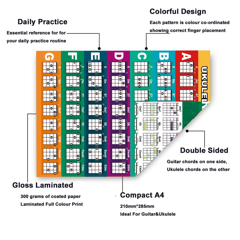 - Laminated guitar&ukulele chords chart poster : our guitar&ukulele chord sheet are made of thickened paper, high-definition printing and laminating, sturdy and durable, waterproof and easy to clean