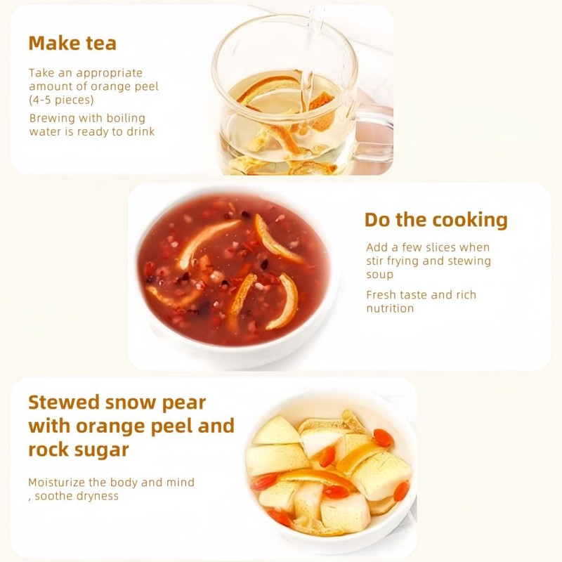 - The method of consuming citrus peel 1. Citrus peel Congee: When cooking rice porridge, put a few clean citrus peel together, Congee tastes delicious . 2. Citrus Peel Soup: When making meat soup or pork rib soup, add a few clean citrus peels. Not only does the soup taste delicious, but it also has a faint citrus flavor, which reduces the greasy feeling when eaten.