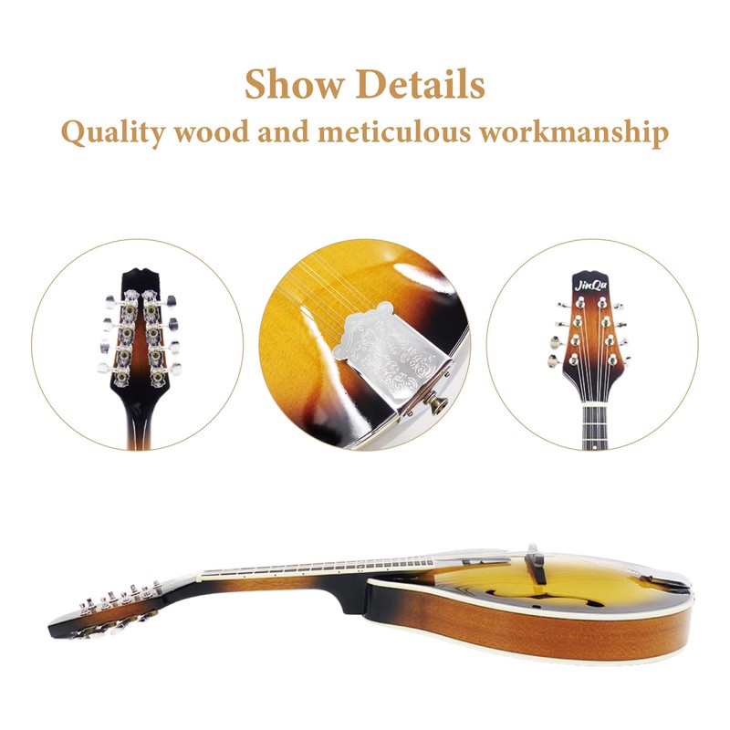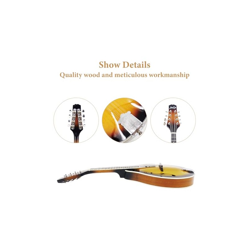JinQu Model A mandolin instrument for beginners, children, adults; 8-string acoustic mandolin selection of spruce and Sabili; Starter kit: Tuner, strings, straps, pick, wipe cloth,Sunburst