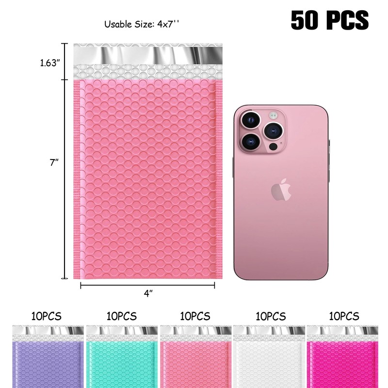 - Multicolored Bubble Mailer 4x8: These multicolored padded envelopes outer size is 4x8 inch, while the inner size is 4x7 inch. There are 10 pieces each of pink, white, green, purple, and rose to meet your color requirements. It is very suitable to transport for cosmetics, jewelry, handmade crafts, electronic accessories, and more. padded envelopes offer an economical way to ship packages.