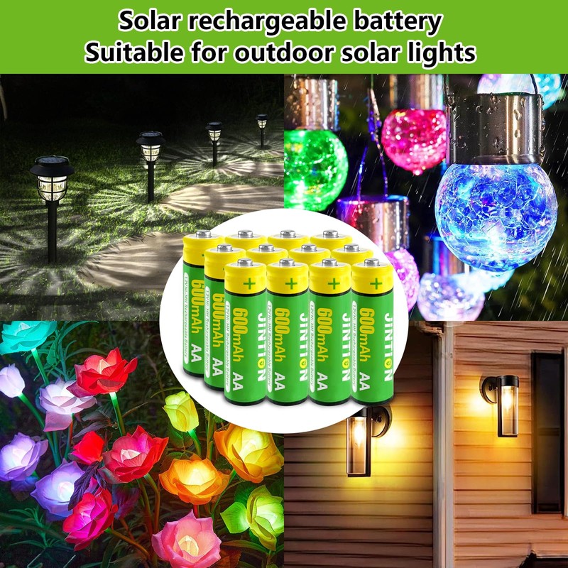 JINTION AA Rechargeable Solar Lights Batteries 600mah High Capacity 1.2V Ni-MH Double a Battery for Outdoor Solar Lights, String Light, Lantern, TV Remotes, Flashlight, 12 Pack