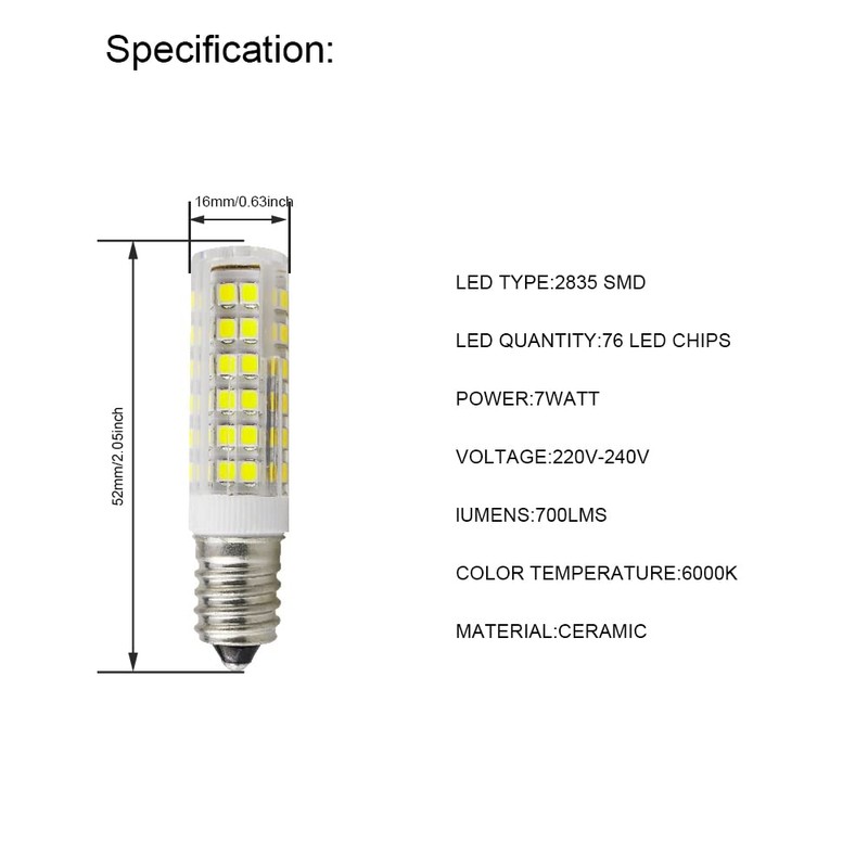 - Wide application: standard E14 socket. Size: 15 x 65 mm. Please check the size before purchasing. Ideal for refrigerator, cooker hoods, sewing machines, cabinet light, bedroom, living room, kitchen, desk lamp, chandeliers, etc.