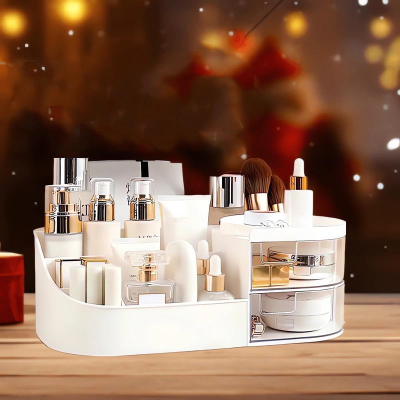 - Large capacity vanity organiser: makeup organiser total size is: 28.5 x 16 x 10.5 cm, including 6 compartments, 2 transparent drawers and 1 round tray. This makeup organizer can store cosmetics, makeup brushes, lipsticks, perfume, jewelry, skin care products, etc.