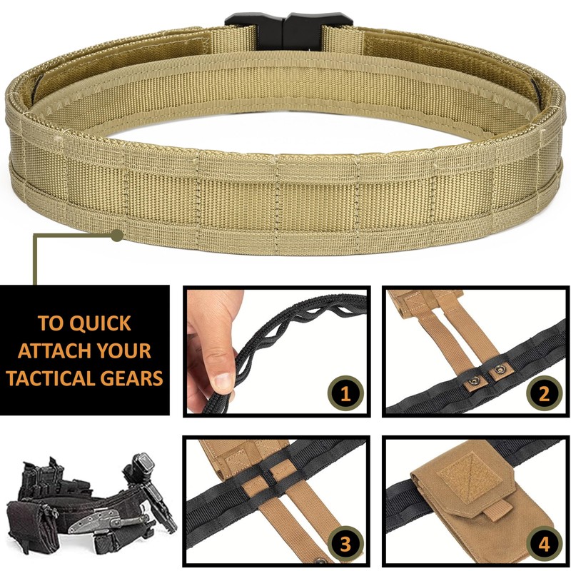 - MOLLE SYSTEM: The heavy-duty load-bearing construction of our tactical belt allows you to comfortably attach extra ammunition, storage pouches, medical packs, tactical gear, and anything else you might need in a firefight or at the range. Used as a battle belt, patrol belt, or duty belt, this gun belt is perfect for first responders, law enforcement, and shooting enthusiasts.