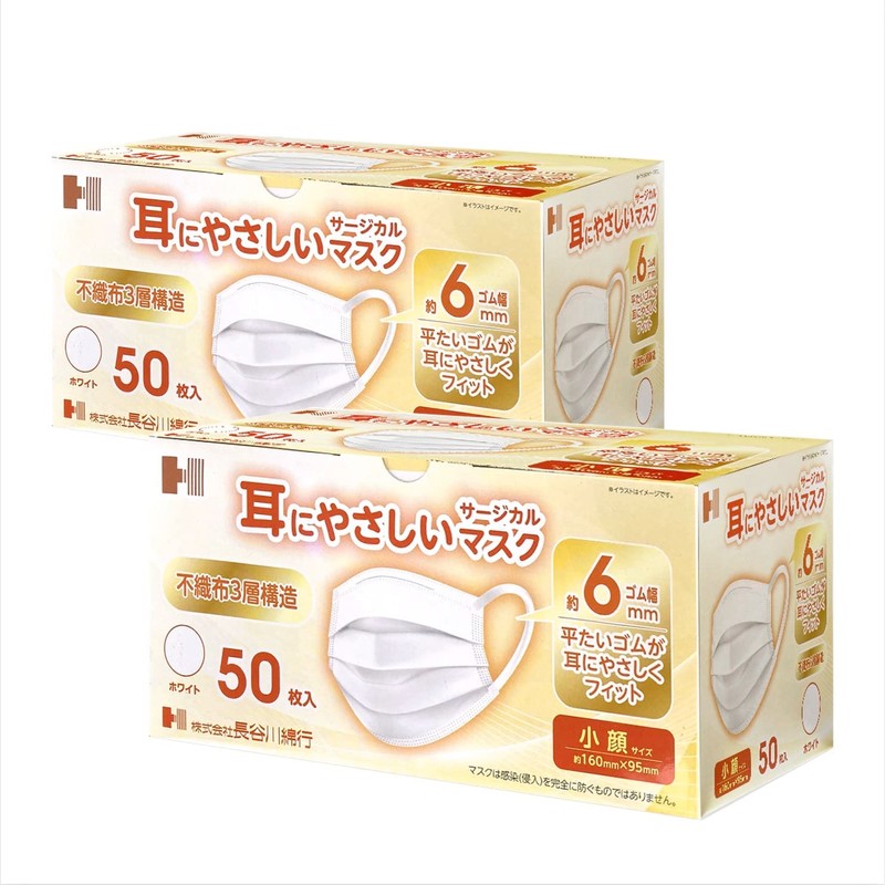 [長谷川綿行] 耳にやさしいサージカルマスク 不織布 JIS適合 16cm 耳ひも6mm 小顔 〜 やや小さめ 2箱100枚