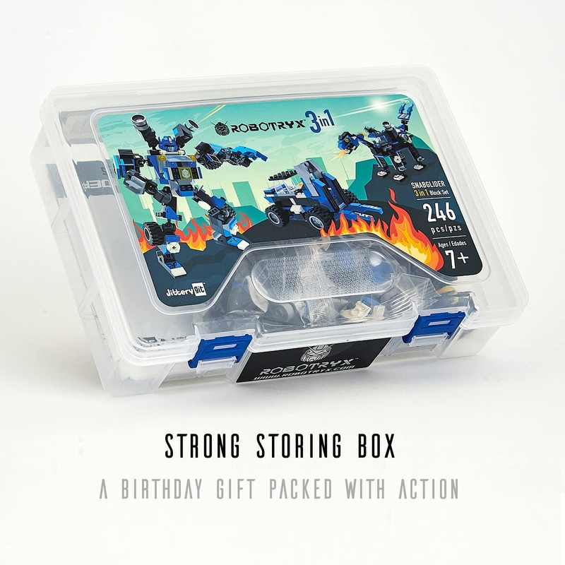 - 【The only building bricks set with a storage box】Each of our designed in USA Robotryx kits comes in a colorful storage box in which all the pieces can be stored after play. This means no more mess to give parents a easy break. It also means on-the-go fun with ready portability that can be taken wherever kids go so they can stage outer space battle scenes.