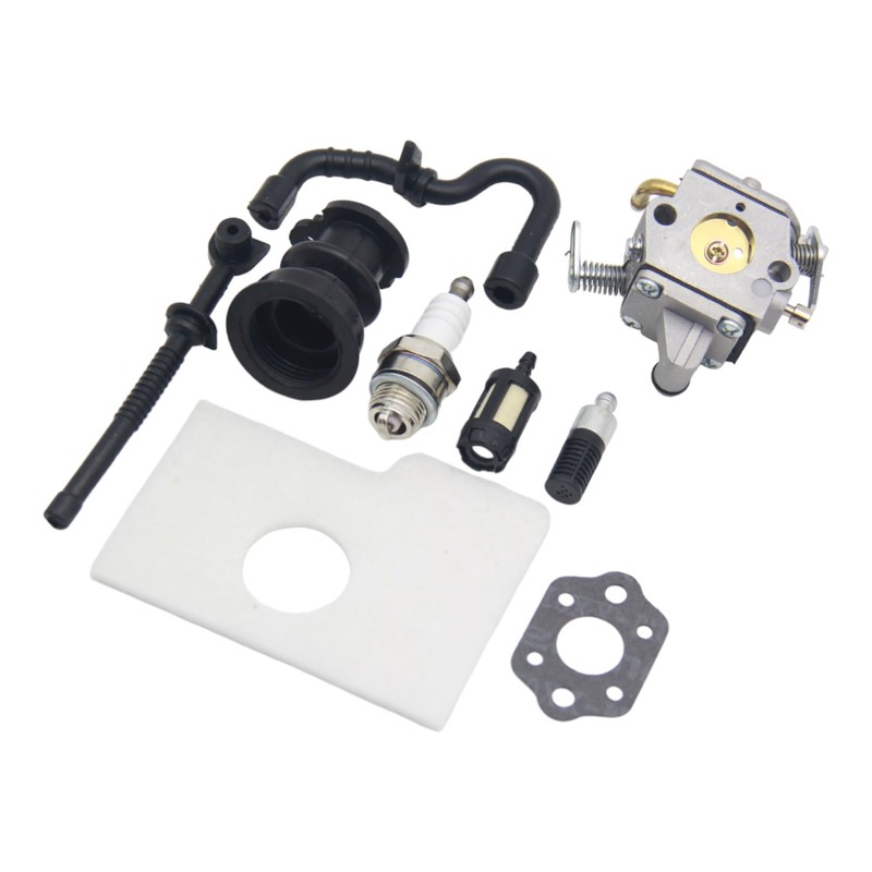 - COMPREHENSIVE PACKAGE: Includes 1 carburetor, 1 gasket, 1 buffer, 1 buffer gasket of the oil tank, 1 tank cover gasket, 1 fuel filter, 1 oil filter, 1 fuel line, 1 oil line, 1 spark plug, and 1 air filter.