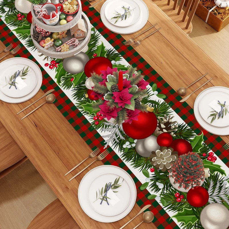 Jiudungs Linen Red and Green Buffalo Check Plaid Christmas Table Runner 108 Inches Long Farmhouse Winter Christmas Xmas Holiday Home Kitchen Table Decorations