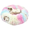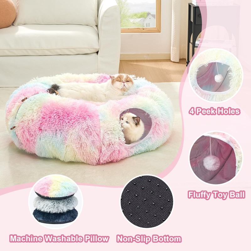 JIUPETY Cat Tunnel Bed with Soft Plush Mat, Collapsible Tube Playground, Cat Toy Tunnel for Indoor Cats, Kitten, Rabbit, Ferret, Fluffy Plush Material, Includes Dangling Balls, Rainbow