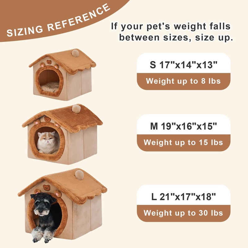 - 【Cute Cat Hut Size & Fits】Covered cat bed M size:19L x 16W x 15H inches. Cat homes for indoor cats is suitable for less than 17 lbs of cats, kittens, puppies & small dogs. You can choose a pet bed suitable for your pet based on the provided sizes, ensuring that your pet enjoys a comfortable life.
