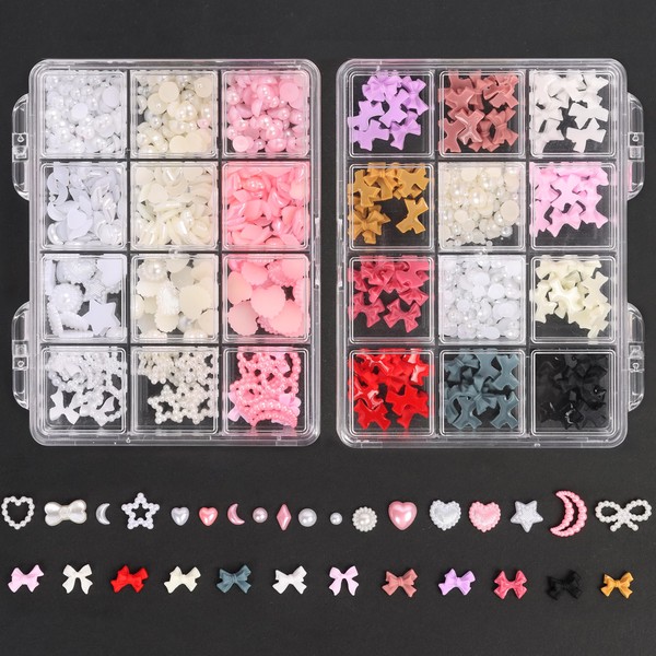 - Nail Charms Art Decoration, Butterfly Bowknot Flower Nail 2 Boxes Multi Shapes Mix Bow Nail, Cute Pearl Heart Star Moon Nail Art for Women Girls DIY Crafts Design Accessories.