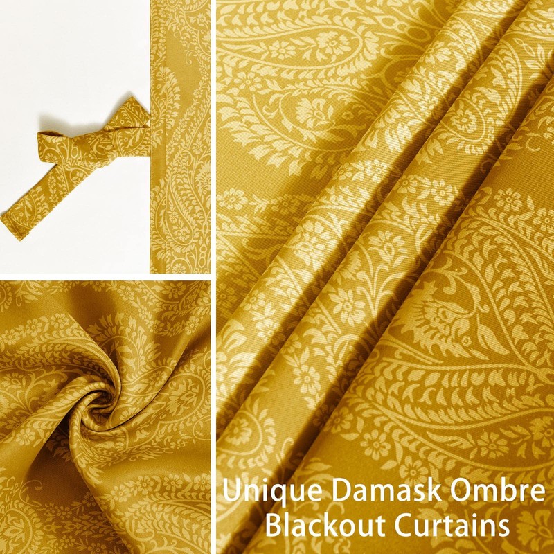 JIUZHEN Yellow Ombre Blackout Curtains for Bedroom – Damask Patterned Thermal Insulated Energy Saving Grommet Curtains with Tiebacks, 52 x 96 Inch, Set of 2 Panels