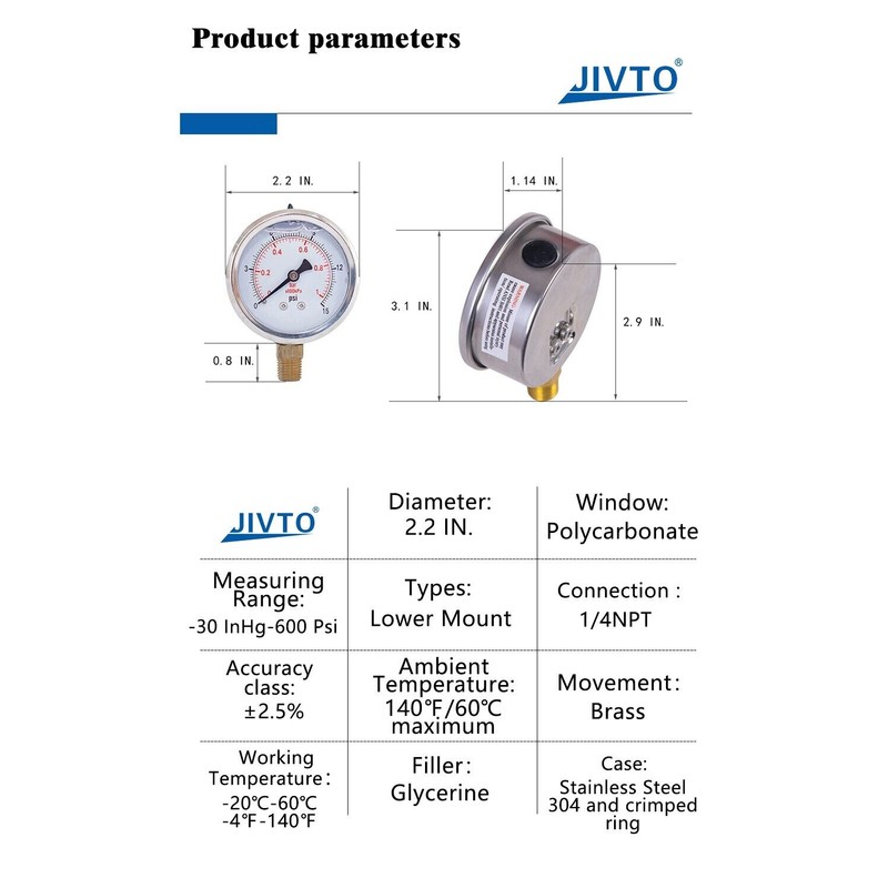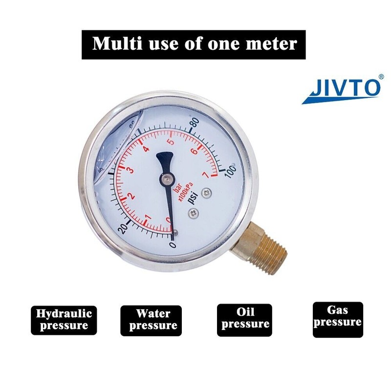 JIVTO Pressure Gauge,Liquid Filled,2" Dia,0-200 PSI,1/4 NPT Lower Mount