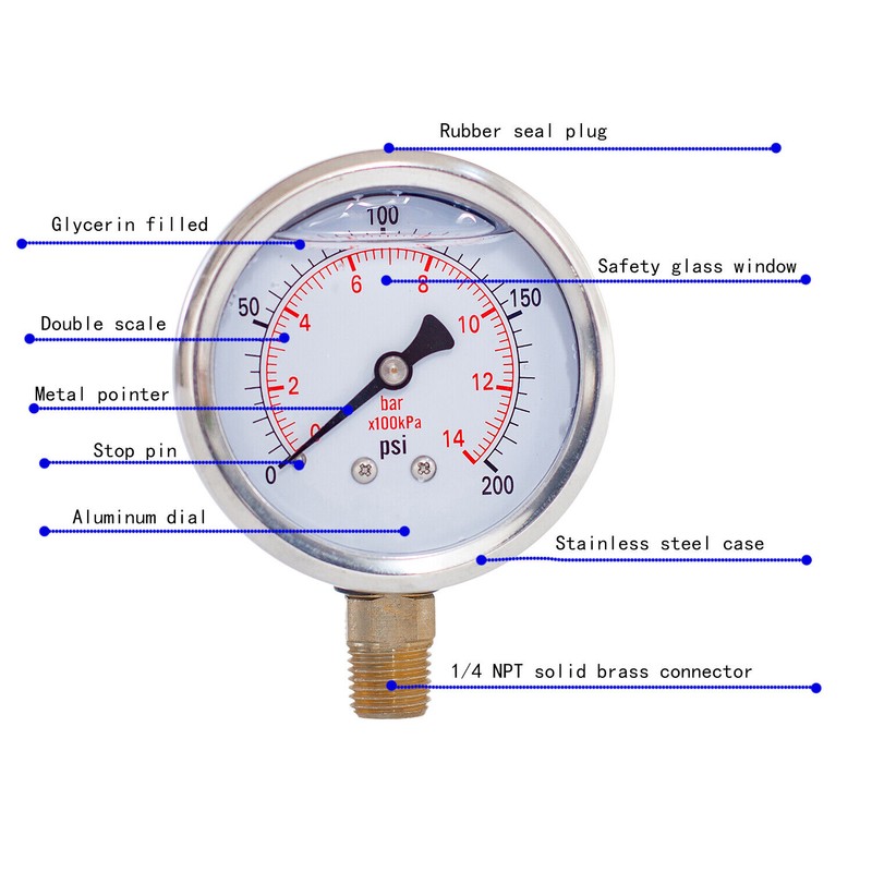 This **2" diameter, liquid-filled pressure gauge** is designed for reliable and accurate pressure measurement in demanding industrial, hydraulic, pneumatic, and process control applications. The **0-200 PSI range** makes it ideal for monitoring medium-pressure systems, while the **1/4" NPT lower mount** ensures easy installation in pipelines, compressors, pumps, and other equipment.