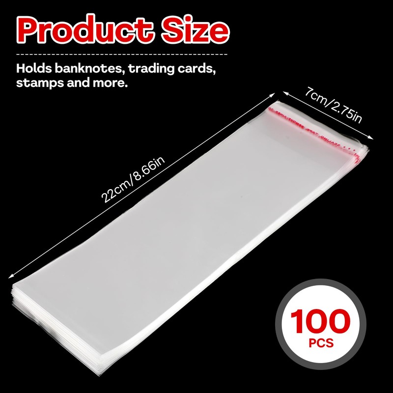 JIYIN 100 Pack Clear Paper Money Holders, Dollar Bill Sleeves 8.6X2.7in Currency Collection Sleeves Protector Bag, Resealable Adhesive Self-Sealing Packing Bag for Banknote Bill Trading Card Stamp