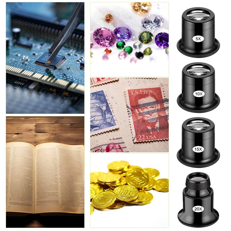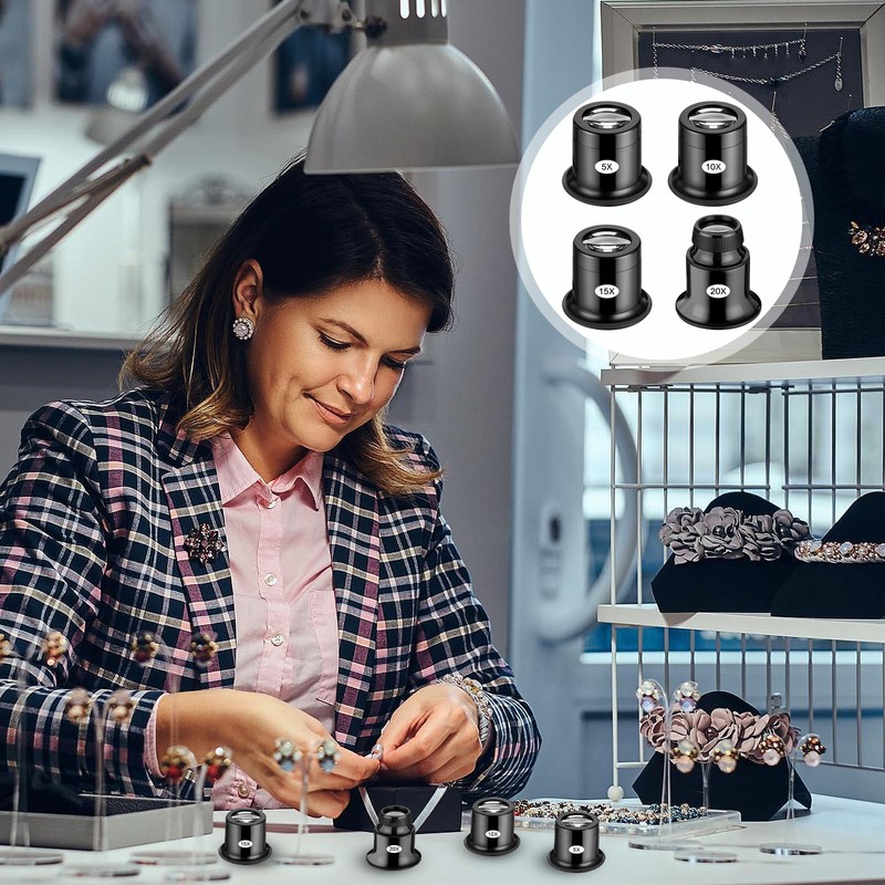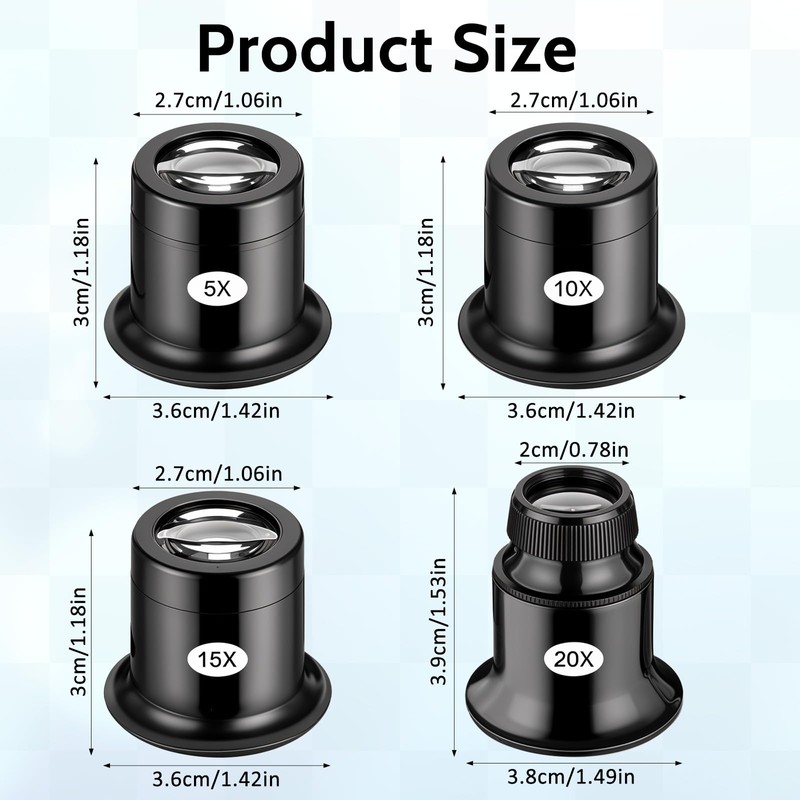 • 【Wide Magnification Options】This eye magnifier for watchmakers have four different magnifications: 5x, 10x, 15x and 20x, you can easily choose the magnifying glasses that meet your specific needs magnification, magnifying glass allows you to see details clearly and accurately. You can easily distinguish and display items used to repair watches and other items.