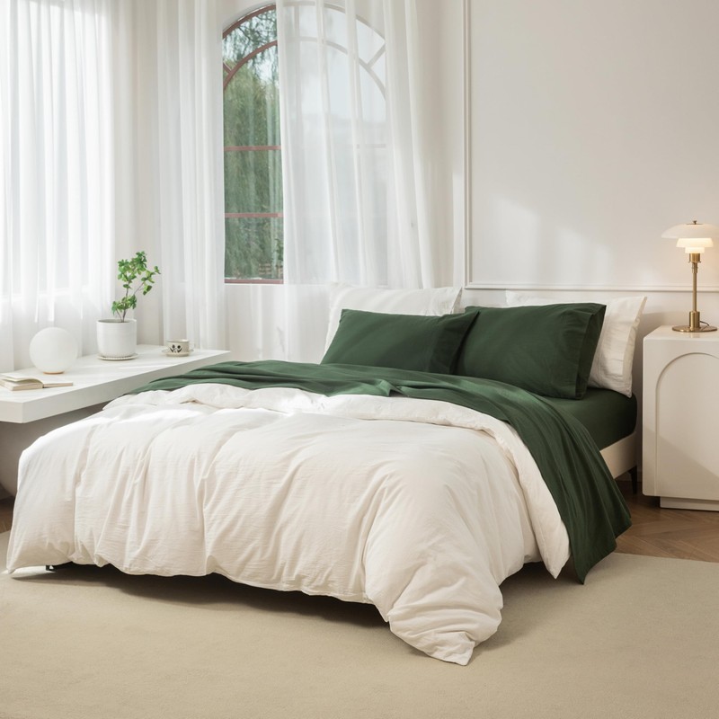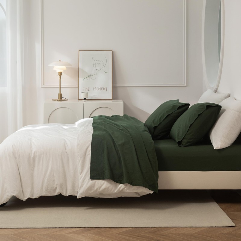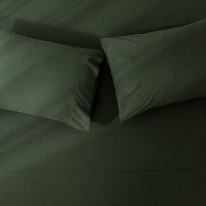 JIYUAN 100% Washed Cotton Sheet Set 4PCS Comfy Simple Style Soft Breathable Textured Durable Linen Feel Bedding for All Seasons King Size, Forest Green